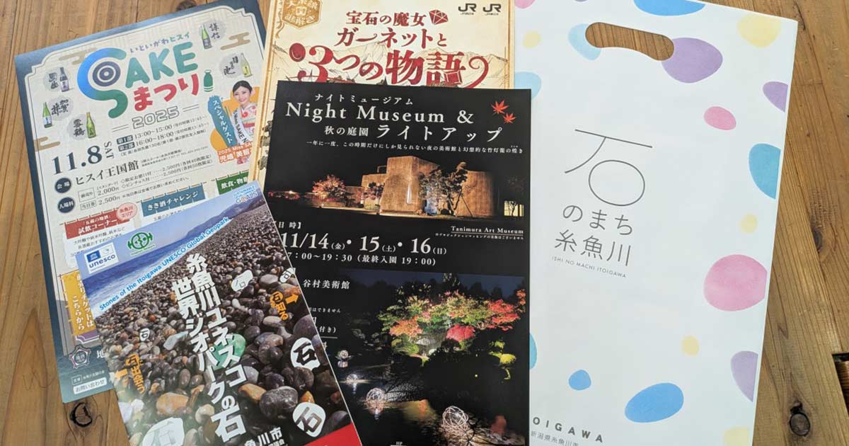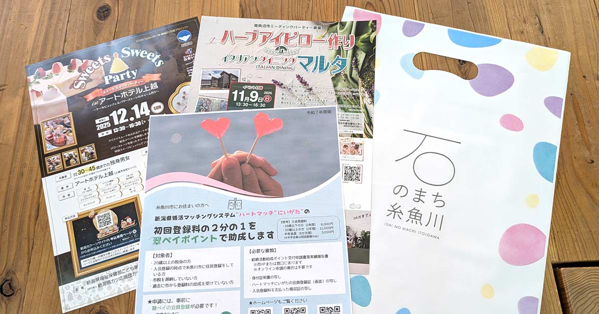 糸魚川市と上越市の観光パンフレットや婚活情報も、糸魚川市ご提供「石のまち糸魚川」の素敵なデザインの手提げ袋に入れてお渡ししました。