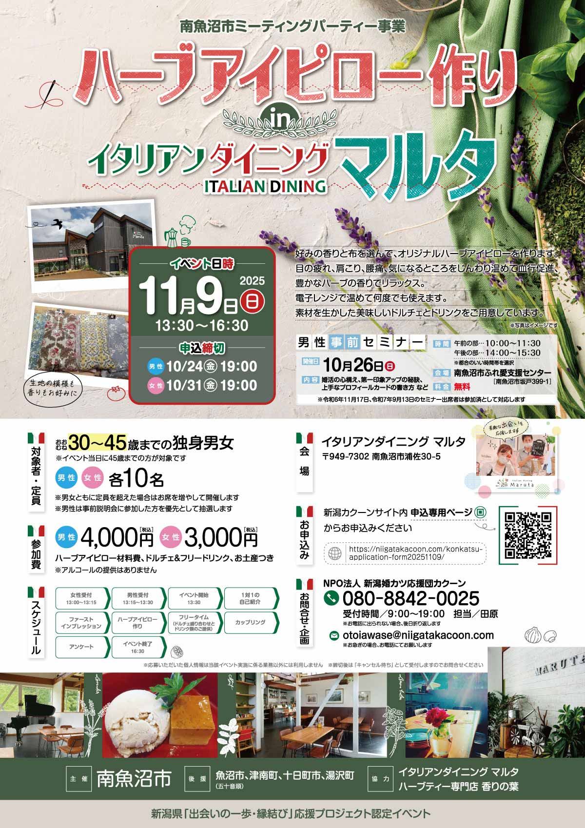 (一社)湯沢町観光まちづくり機構 (3) (株)FORBAL (4) (株)FunFreaksイベント事業部 (2) CAFE GEORG (2) LA’NANSHi ANESAMEGOi (2) mari*pass niigata (1) NPO法人新潟婚カツ応援団カクーン (47) sns (1) VOICE STUDIO COMPANY (2) YODEL-GARDEN (2) yyPARK (2) かしわざき元気館 (1) とおかまちマリアージュ (22) ながおか・若者・しごと機構 (1) にいがた出会いサポートセンター (3) イタリアンダイニングマルタ (7) イタリア料理&バール たんと (2) ウエスタンバーForty-Niners (3) ナリスビューティーステーション デアイム新潟西 (6) ハートマッチにいがた (6) ハーブアイピロー (6) パーソナルカラーネイルサロンRiage (2) レポート (45) 上田市役所 (1) 公益財団法人燕西蒲勤労者福祉サービスセンター (3) 出雲崎町役場 (1) 十日町市役所 (3) 南魚沼市役所 (3) 土田衛 (3) 地域の世話焼き人 (25) 妙高市の取り組み (1) 妙高市役所 (1) 妙高市開催のイベント (3) 妙高市開催のセミナー (2) 婚活を応援する人 (25) 婚活応援めぐりあいサポートセンター (1) 官公庁 (24) 小須戸まちづくりセンター (3) 小須戸コミュニティ協議会 (3) 山の手コミュニティ協議会 (6) 新潟みなみ商工会青年部 (3) 新潟市中央区 (2) 新潟市役所 (1) 新潟市江南区 (2) 新潟市秋葉区 (3) 新潟県「あなたの婚活」応援プロジェクト (1) 新潟県「出会いの一歩・縁結び」応援プロジェクト (1) 新潟県スポーツ課 企画係 (6) 新潟県三条市 (1) 新潟県上越市 (4) 新潟県加茂市 (1) 新潟県十日町市 (37) 新潟県小千谷市 (30) 新潟県弥彦村 (2) 新潟県新潟市 (15) 新潟県新発田市 (1) 新潟県柏崎市 (1) 新潟県津南町 (9) 新潟県燕市 (12) 新潟県田上町 (1) 新潟県福祉保健部 (14) 新潟県福祉保健部こども家庭課 (16) 新潟県聖籠町 (1) 新潟県胎内市 (1) 新潟県見附市 (1) 新潟県農協青年連盟 (1) 新潟県長岡市 (4) 新潟県関川村 (1) 新潟県阿賀町 (1) 新潟県阿賀野市 (10) 新潟県阿賀野市のハーブティー専門店 香りの葉 (21) 新潟県魚沼市 (12) 新発田市役所 (1) 有限会社プロス (2) 有限会社ヤマキ観光 (2) 株式会社エフエムとおかまち (1) 株式会社鶴亀社 (2) 湯沢町役場 (3) 潟東商工会 (2) 燕三条イタリアンビット燕三条本店 (1) 田上町役場 (1) 男性事前説明会 (3) 白根青年会議所 (5) 糸魚川市の取り組み (1) 糸魚川市役所 (15) 結婚応援団燕縁の会 (5) 聖籠町役場 (1) 胎内市役所 (1) 苗場インディペンデンス・ボードウォーク (4) 苗場プリンスホテル (4) 見附市役所 (1) 越後妻有ハピ婚サポートセンター (13) 長野県上田市 (11) 長野県長和町 (3) 長野県長和町社会福祉協議会 (3) 関川村役場 (1) 阿賀野市役所 (8) 高士地区雪まつり実行委員会 (2) 魅力アップセミナー (2) 魚沼市役所 (1)