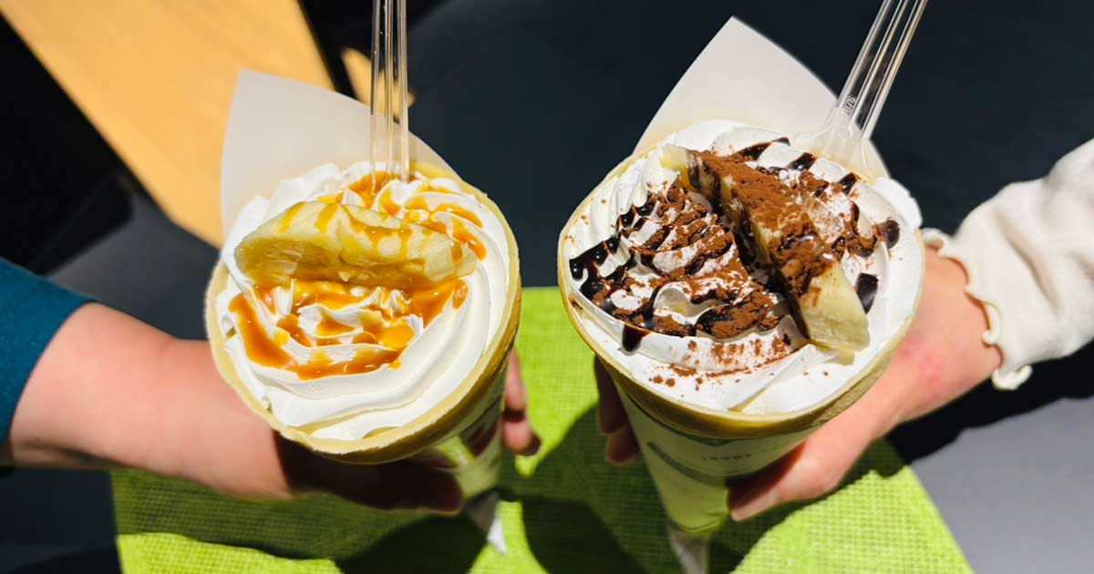 屋根付き屋外広場では、キッチンカーでクレープを食べます。