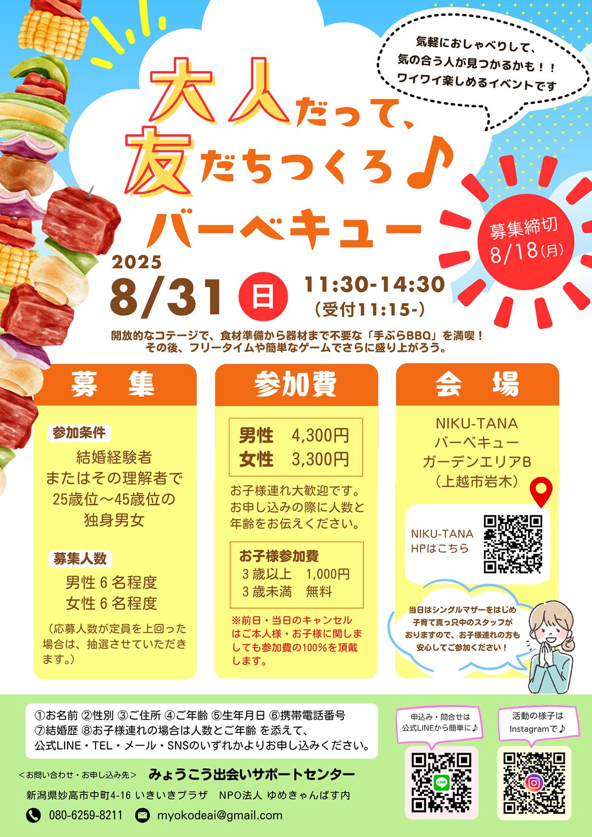 8月のイベントの紹介です「大人だって、友達つくろ♪バーベキュー」を開催します。