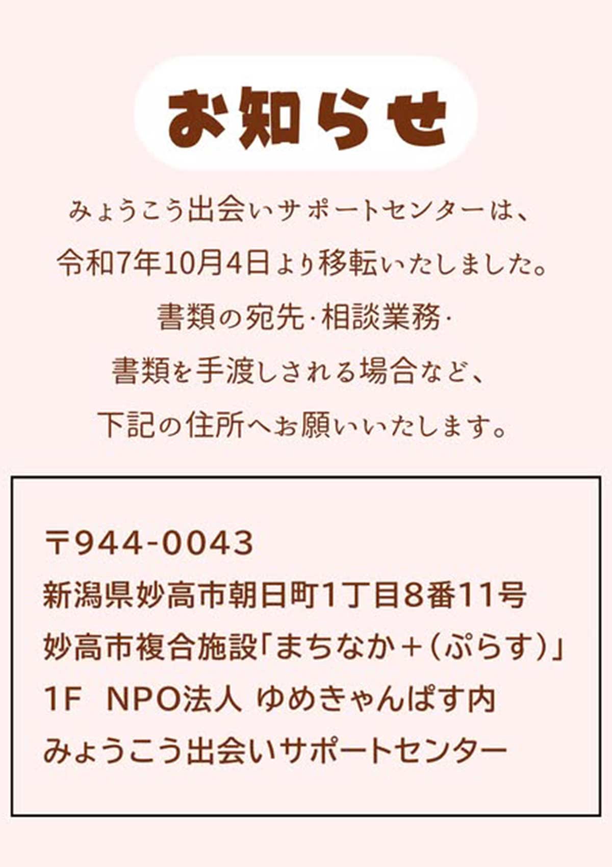 (一社)湯沢町観光まちづくり機構 (3) (株)FORBAL (4) (株)FunFreaksイベント事業部 (2) CAFE GEORG (2) LA’NANSHi ANESAMEGOi (2) mari*pass niigata (1) NPO法人新潟婚カツ応援団カクーン (48) sns (1) VOICE STUDIO COMPANY (2) YODEL-GARDEN (2) yyPARK (2) かしわざき元気館 (1) とおかまちマリアージュ (22) ながおか・若者・しごと機構 (1) にいがた出会いサポートセンター (3) イタリアンダイニングマルタ (7) イタリア料理&バール たんと (2) ウエスタンバーForty-Niners (3) ナリスビューティーステーション デアイム新潟西 (6) ハートマッチにいがた (6) ハーブアイピロー (6) パーソナルカラーネイルサロンRiage (2) レポート (45) 上田市役所 (1) 公益財団法人燕西蒲勤労者福祉サービスセンター (3) 出雲崎町役場 (1) 十日町市役所 (3) 南魚沼市役所 (3) 土田衛 (3) 地域の世話焼き人 (25) 妙高市の取り組み (1) 妙高市役所 (1) 妙高市開催のイベント (3) 妙高市開催のセミナー (2) 婚活を応援する人 (25) 婚活応援めぐりあいサポートセンター (1) 官公庁 (24) 小須戸まちづくりセンター (3) 小須戸コミュニティ協議会 (3) 山の手コミュニティ協議会 (6) 新潟みなみ商工会青年部 (3) 新潟市中央区 (2) 新潟市役所 (1) 新潟市江南区 (2) 新潟市秋葉区 (3) 新潟県「あなたの婚活」応援プロジェクト (1) 新潟県「出会いの一歩・縁結び」応援プロジェクト (1) 新潟県スポーツ課 企画係 (6) 新潟県三条市 (1) 新潟県上越市 (4) 新潟県加茂市 (1) 新潟県十日町市 (37) 新潟県小千谷市 (30) 新潟県弥彦村 (2) 新潟県新潟市 (15) 新潟県新発田市 (1) 新潟県柏崎市 (1) 新潟県津南町 (9) 新潟県燕市 (12) 新潟県田上町 (1) 新潟県福祉保健部 (14) 新潟県福祉保健部こども家庭課 (17) 新潟県聖籠町 (1) 新潟県胎内市 (1) 新潟県見附市 (1) 新潟県農協青年連盟 (1) 新潟県長岡市 (4) 新潟県関川村 (1) 新潟県阿賀町 (1) 新潟県阿賀野市 (10) 新潟県阿賀野市のハーブティー専門店 香りの葉 (21) 新潟県魚沼市 (12) 新発田市役所 (1) 有限会社プロス (2) 有限会社ヤマキ観光 (2) 株式会社エフエムとおかまち (1) 株式会社鶴亀社 (2) 湯沢町役場 (3) 潟東商工会 (2) 燕三条イタリアンビット燕三条本店 (1) 田上町役場 (1) 男性事前説明会 (3) 白根青年会議所 (5) 糸魚川市の取り組み (1) 糸魚川市役所 (15) 結婚応援団燕縁の会 (5) 聖籠町役場 (1) 胎内市役所 (1) 苗場インディペンデンス・ボードウォーク (4) 苗場プリンスホテル (4) 見附市役所 (1) 越後妻有ハピ婚サポートセンター (13) 長野県上田市 (11) 長野県長和町 (3) 長野県長和町社会福祉協議会 (3) 関川村役場 (1) 阿賀野市役所 (8) 高士地区雪まつり実行委員会 (2) 魅力アップセミナー (2) 魚沼市役所 (1)